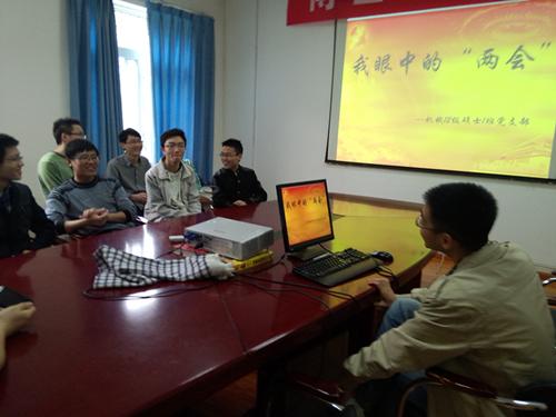 活动主要以探讨交流的形式展开。活动开始,雷敬文为该党支部党员大致介绍了“两会”的流程和内容,并将此次“两会”中讨论涉及到的十大热点话题以PPT的形式呈现给大家,话题包含了“深化改革”、“反贪腐”、“环保”、“城镇化”、“就业”、“食品安全”、“收入分配”等重要内容。随后党员都谈了谈自己对这些“两会”热点话题的想法。有的党员同学很重视“食品安全”,认为首先要在食品源头的进货和储存进行统一登记管理,对公众及时透明公布相关信息,对有问题的食品餐饮单位执法要严,一旦发现问题必须严惩。不过作为即将踏入社会的研究生,大部分同学对“就业难问题”持着更多的关注热情,大家以互相探讨交流的形式阐述了自己的思考。有的同学认为自己必须在学校加强自身专业能力的提升,对以后的工作打好理论基础;有同学认为平时应该积极与用人单位联系,了解他们对招聘者的素质要求,做到“投其所好”,使双方都能够匹配;还有同学认为就业找工作时,可以“不拘一格”找岗位,甚至跨专业跨领域去找自己真正喜欢的工作,这样可以有足够的动力去发挥自身价值。