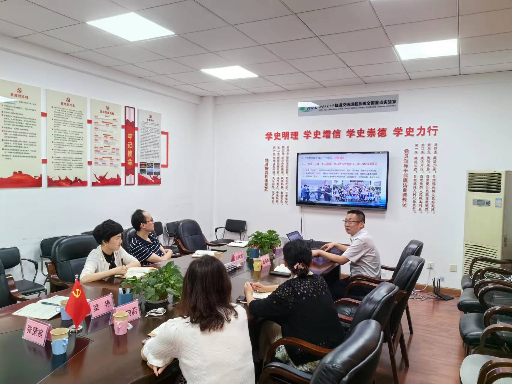 曾东红书记首先对轨道交通运载系统全国重点实验室的大力支持表达了感谢,并就此次调研的重点内容进行了介绍,希望通过交流学习宝贵的经验,进一步推动学院标杆院系和样板党支部的建设工作。王霞书记对bwin必赢唯一官方网站一行的到来表达了热烈欢迎,并分享了轨道交通运载系统全国重点实验室在标杆院系建设过程中的一些特色亮点。赵春发书记详细介绍了列线所教工党支部的具体情况以及创建全国样板党支部的经验和做法。余丙军书记介绍了摩擦所教工党支部的具体情况以及在全国样板党支部建设中的一些困惑和问题。